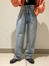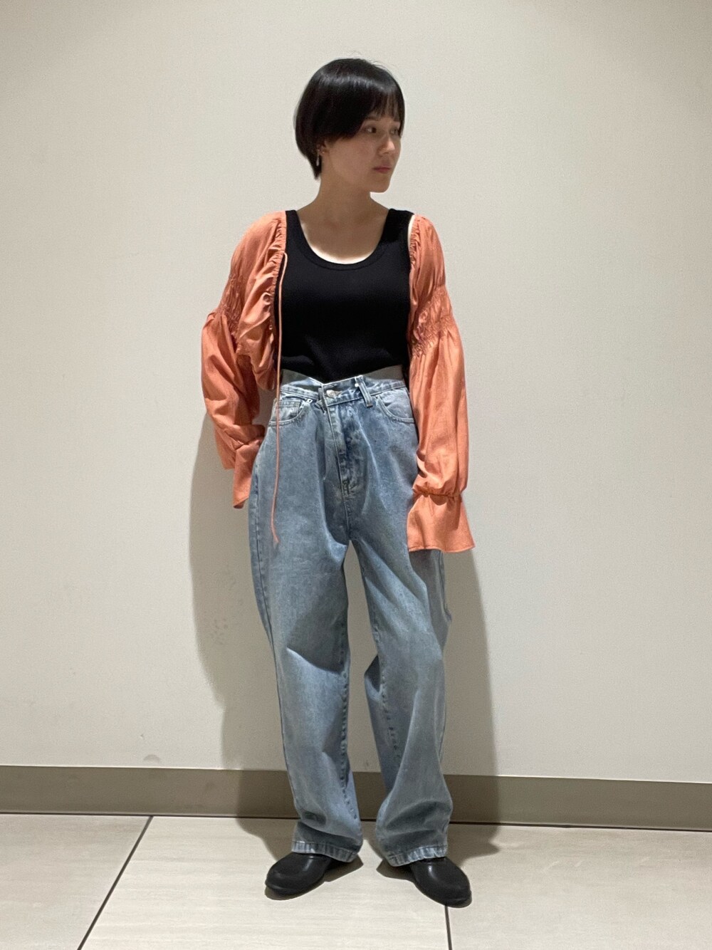 ゆるっとしたデニムにボレロを合わせてバランスよく着れるようにしました! ボレロは前の紐を結んでもそのまま下ろしても🙆♀️ 光沢感のある生地なので綺麗めパンツやオールインワンと組み合わせても可愛いです! 袖口はゴムになっているので、捲っても落ちにくいのもポイントです! パンツはストレートタイプでゆるっとしてますが、横に広がりすぎずバランスよく着ていただけます✨ ウエストは少し大きめです! サイズは36.38で、私は36を着ています!