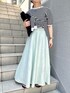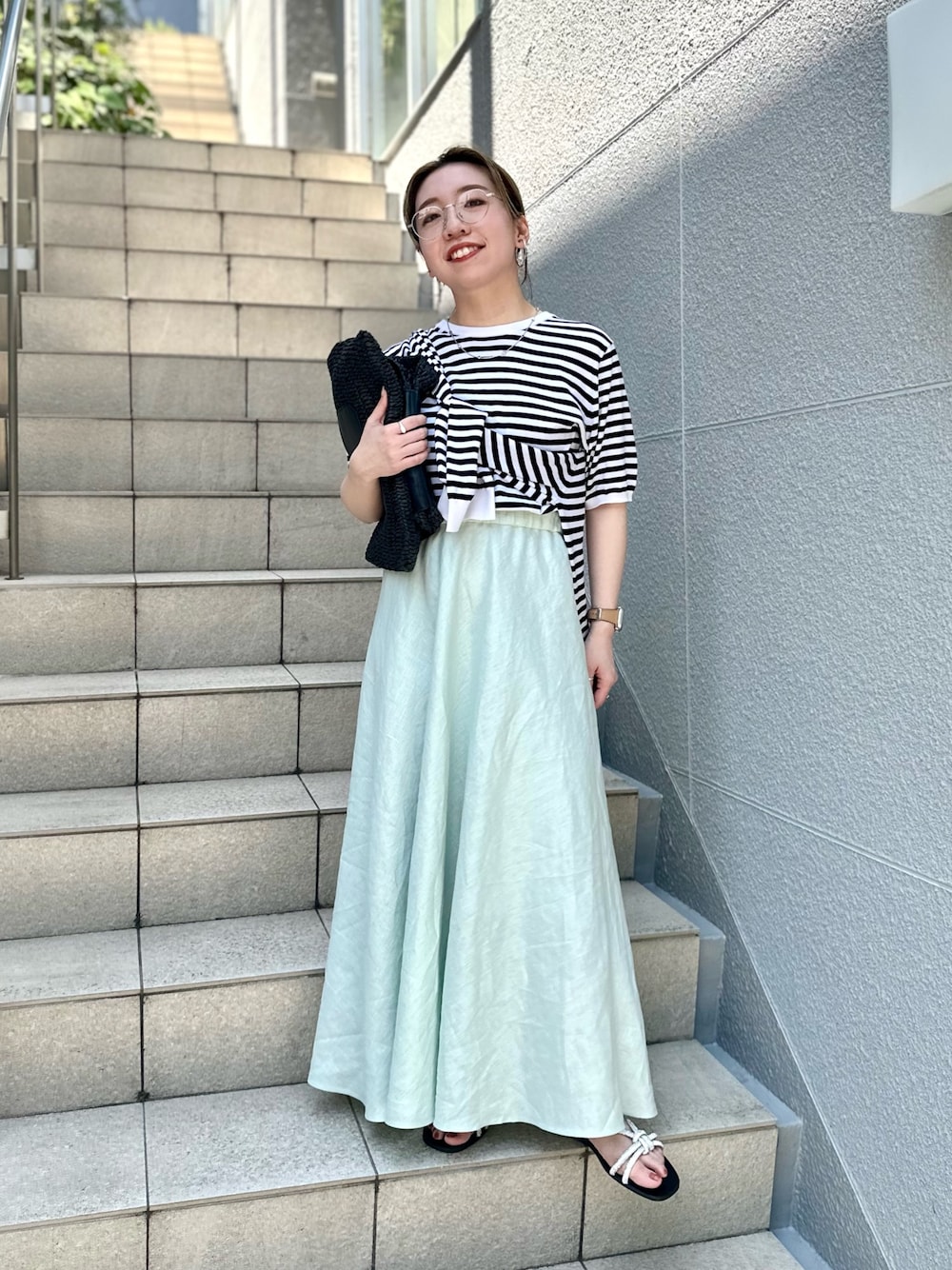 着用サイズ トップス: ワンサイズ スカート: サイズ1 モノトーンにカラースカートで色差しした大人カジュアルコーデ。 ⚫︎トップス ボーダーの半袖ニットはボーダーTシャツとは一味違い、カジュアルすぎず大人かわいい印象にしてくれます。 柔らかくさらっとしたコットンで着心地◎ アンサンブル対応のカーディガンをたすき掛けしてアクセントにしました。 冷房や朝晩ひんやりした時にさっと羽織りにもできるのでおすすめです。 ⚫︎スカート サイズ1、2で着丈差をつくっており、サイズ1なら145cmの私でもペタンコ合わせが出来ました。シルエットもバイヤスで広がりすぎず綺麗なシルエットです。 リネンのさらっとしたナチュラルな風合いと優しいグリーンのカラーが涼しげで夏場にもぴったりな一枚です。 どちらもウォッシャブルなのでこれからの時期も快適です! 足下はキラキラのサンダルで抜け感を出し バッグは雑材にすることで夏コーデに。