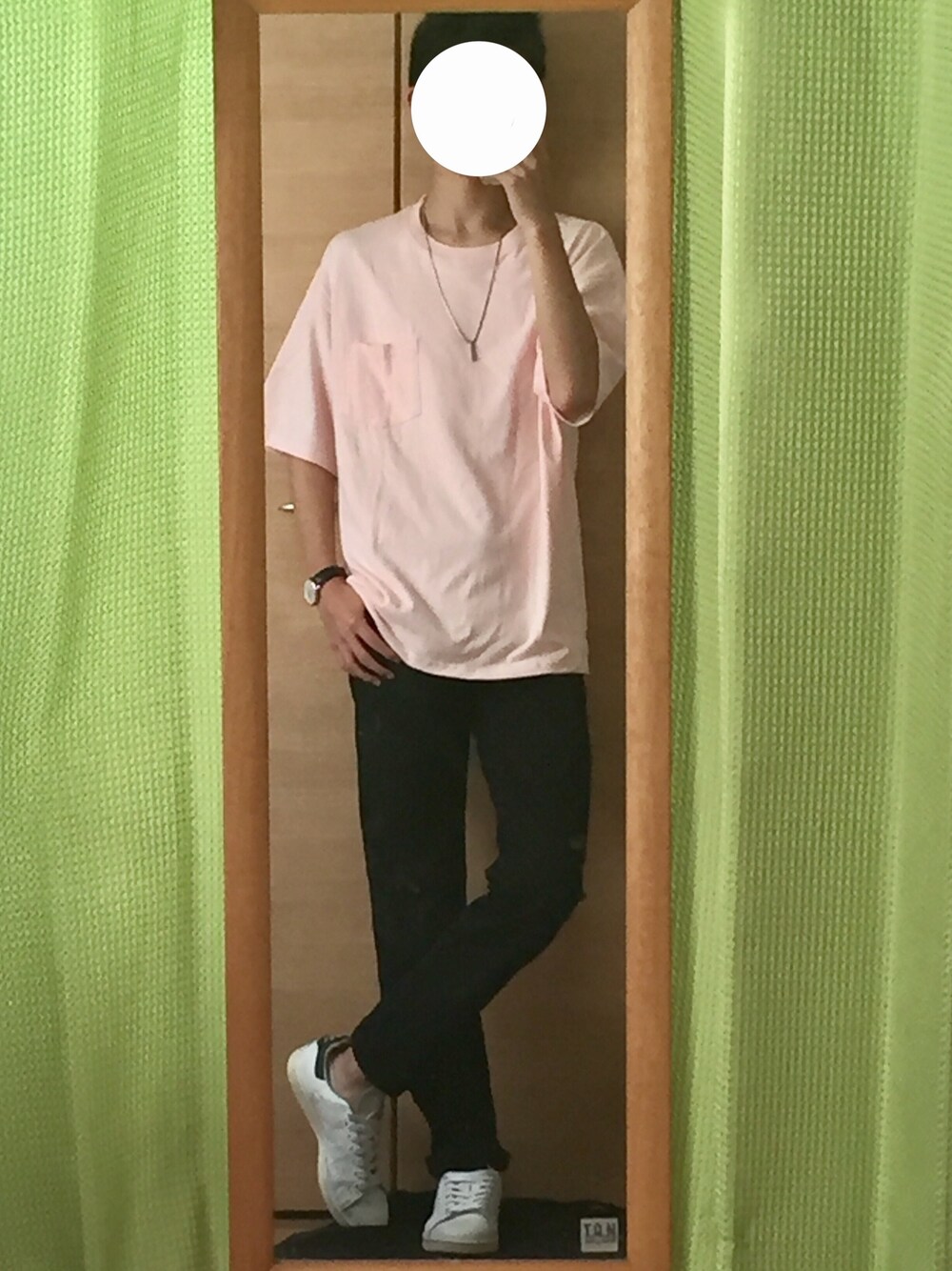 ピンクのビックT×黒スキニーコーデ