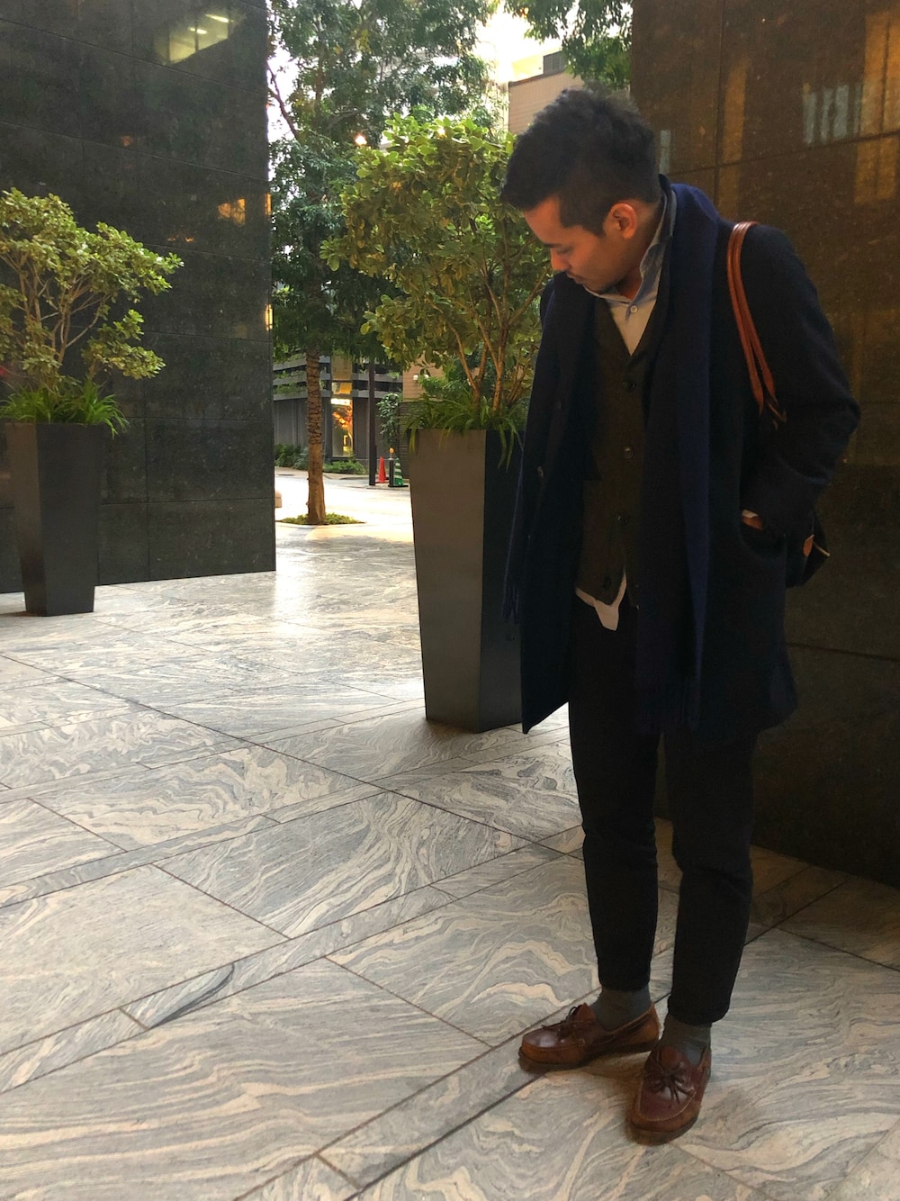 とても寒い! のでチェスターコートにニットにマフラーで完璧。 オフィスカジュアル。