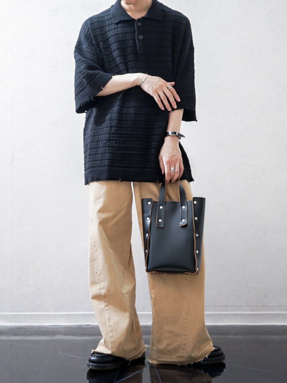 Takiのポロシャツ「【CLEL】Chain Crochet Design Damaged Short Sleeve Knitted Polo/チェーンクロシェデザインダメージ半袖ニットポロ」を使ったコーディネート