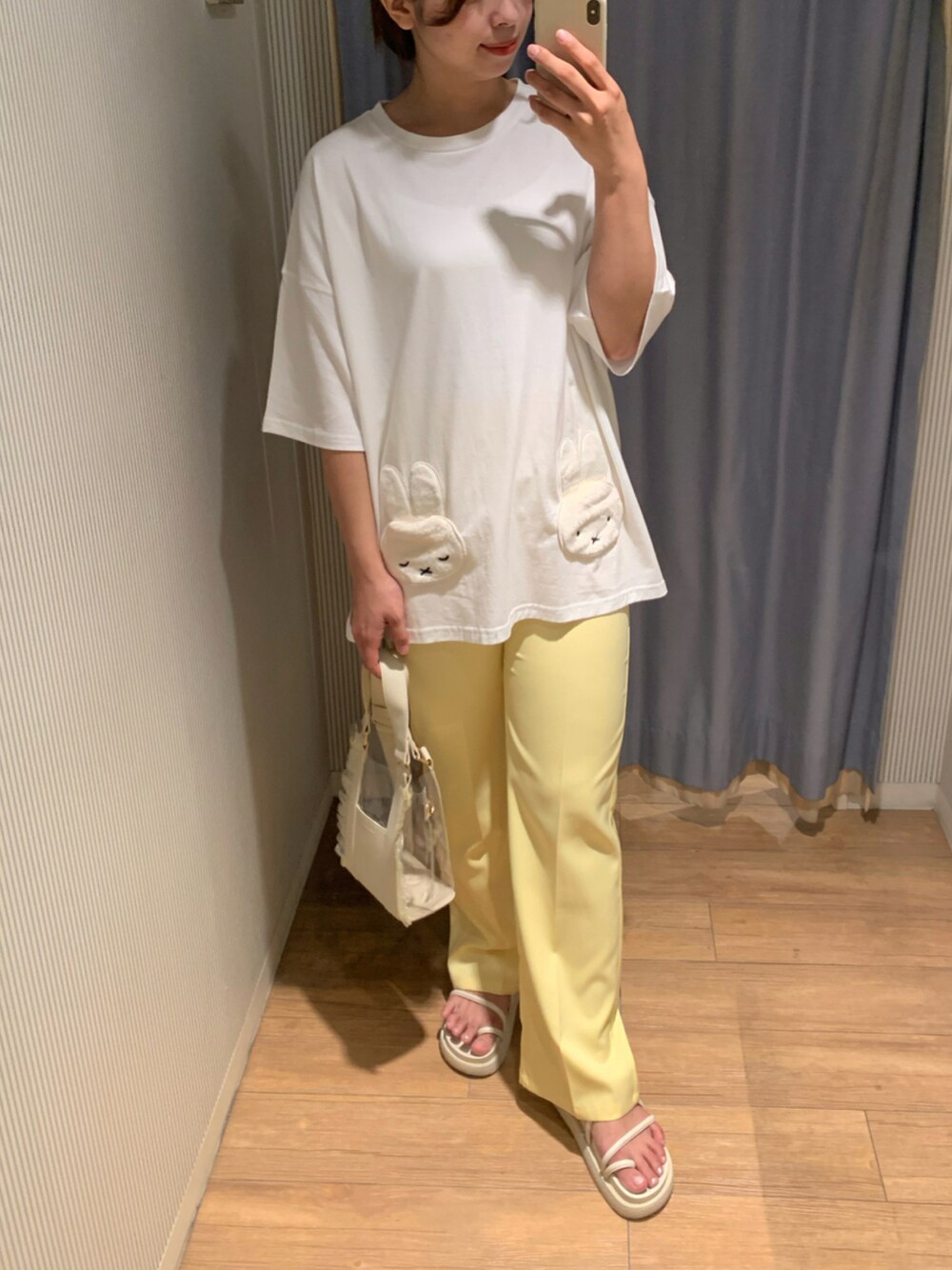 カラースラックスがポイントのミッフィー コーデ❁ ゆるっと着れるTシャツなのでショート丈でワンピっぽく、ロングのスカートで大人めにと合わせて頂けます ♩