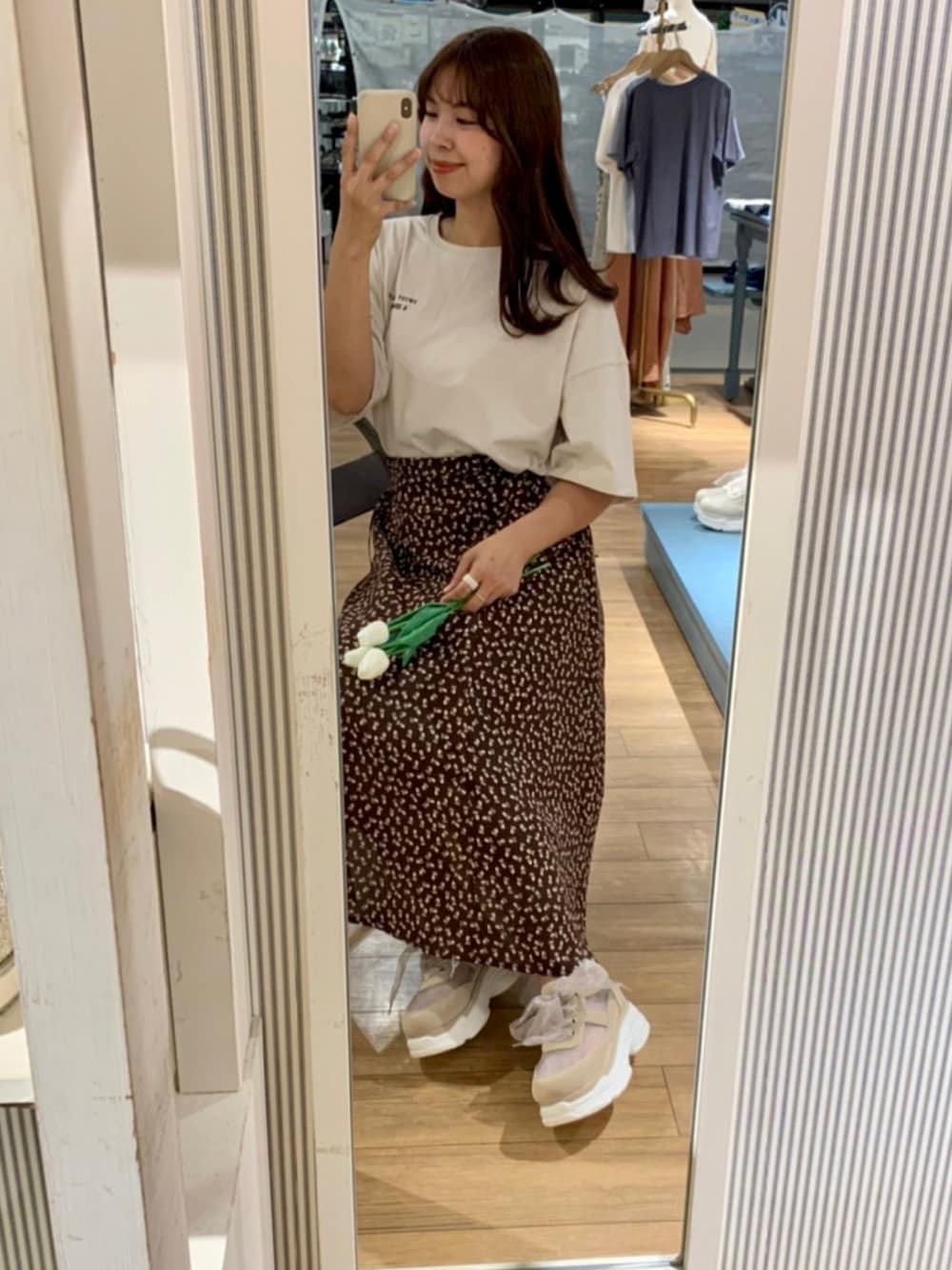 秋を意識したラテコーデ😌 落ち着いて見えるのにちゃんと女性らしさあるコーデは可愛いですね ♩ とろみがあるウエスト痩せしてみえるスカートは座っても綺麗なシルエットになります✨