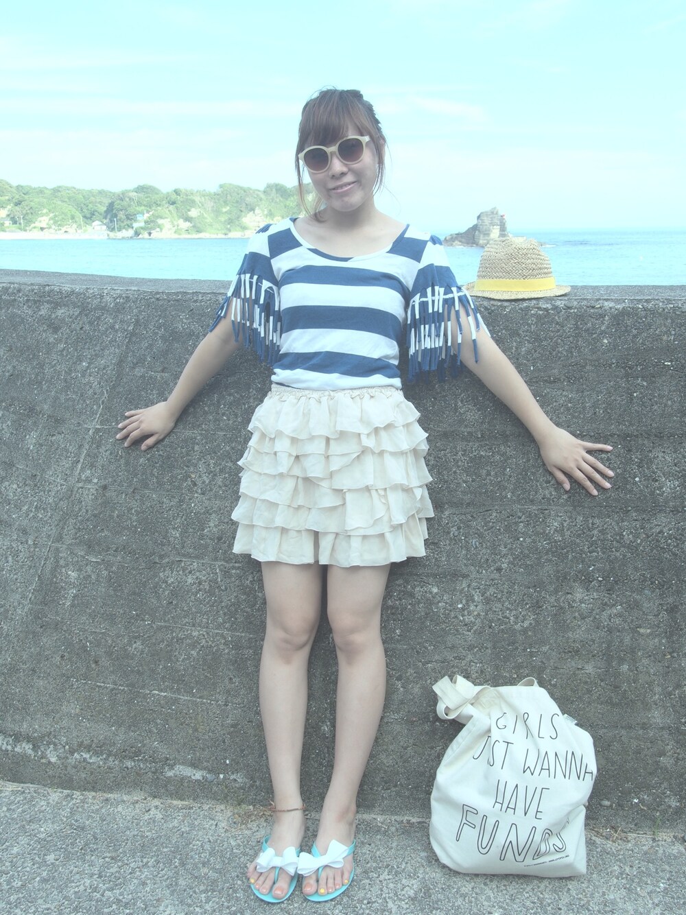 海で遊んだ後の写真も撮りました♪ 髪の毛は邪魔なのでポニーテール! サングラスかけるだけでだいぶ雰囲気が変わるんですね‼ 海ではぷかぷかしたり岩場でザリガニと遊んだり浜辺でのーんびりお菓子食べたり♪ 綺麗な銀色の巻貝も見つけたよっ(*^^*) 太陽にあたるとピカピカして綺麗なの 貝とかで遊ぶの楽しいっ*