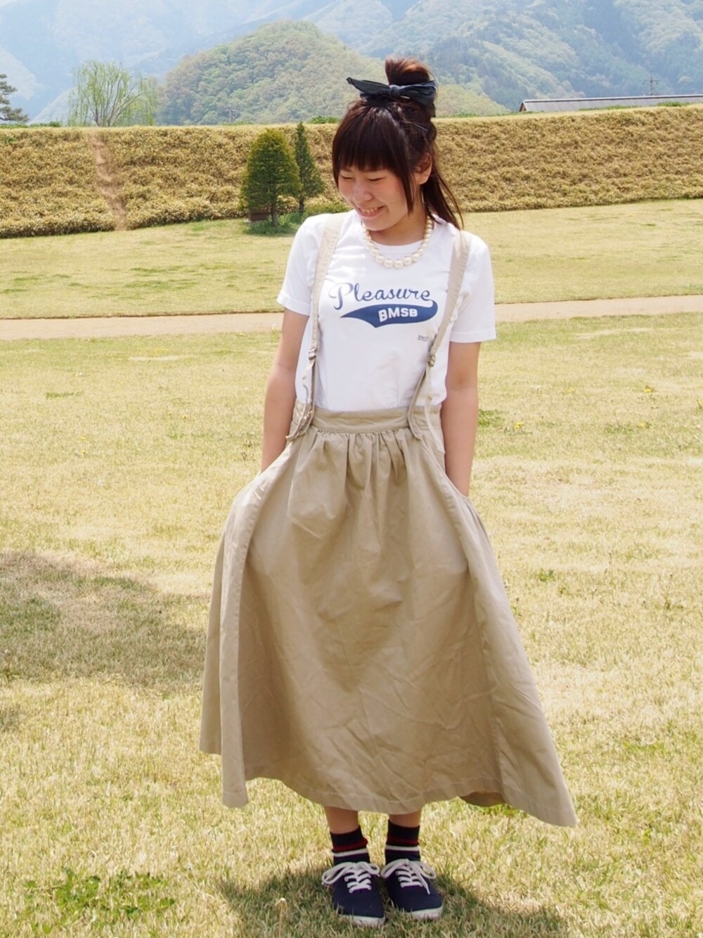 旅行こーでです* たんぽぽがたっくさん咲いていて綺麗でした( ^ω^ ) ビームスのTシャツはシンプルなので何にでも合わせやすそうです パールのネックレスで少しおめかししました!笑 ネックレス/Dot & stripes スニーカー/GU