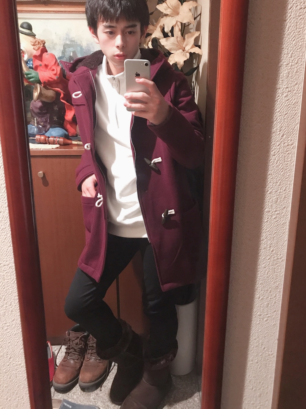 初投稿です° 紫色のシンプルなコートをメインに、中に白を持ってくることで爽やかさを表現し、下は黒のスキニーでシュッとまとまったすっきりとした感じを出しています。 …ブーツは2つあるのでその2つですごく悩みました。 が、 このちょっとワイドめなブーツに細めのスキニーの裾をインするといい感じかなって思ったのと、コートにブーツは定番的に合うと思って靴はこのブーツを選択しました。 僕は背が低いので、服はいつも慎重に選びます。なるべく背が高く見られたいので、上はなるべく丈を短く、横に広いもの、パンツは細めのスキニーなどをよく使います。 あと、今回もそうですが、上は少し目立つ色、下は黒系を持ってくることで、実際よりも大きく見えます。…って聞いたことがあるような…