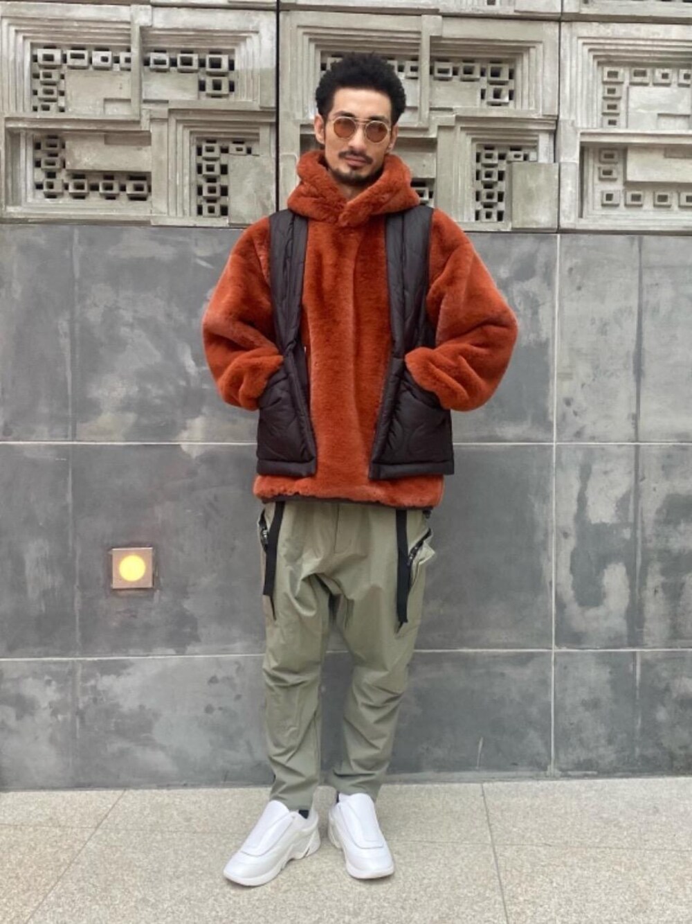 〈UNITED ARROWS&SONS〉のファーブルゾンとベストを着用したストリート軸のコーディネートです。ボトムスとシューズは、ブルゾンの色と素材をより活かせるよう、機能性に富んだ素材とソフトな色を合わせる事でストリート軸の中にも少しクリーンな印象になるよう意識しました。