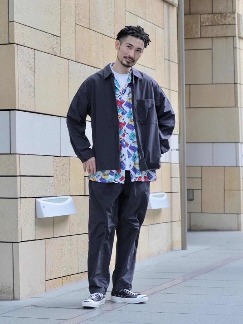 大人に合わせたいオーバーサイズでのセットアップコーディネート。ハリ感が強い無地のオリジナルセットアップはとても汎用性が高いです。インナーは逆にレーヨンやシルクなどを用いた柔らかくしなやかな柄物のオープンカラーシャツを合わせるのが、バランスとしても今の気分です。また、街着として気兼ねなくセットアップを着るには普段より気持ちオーバーサイズがおすすめです。
