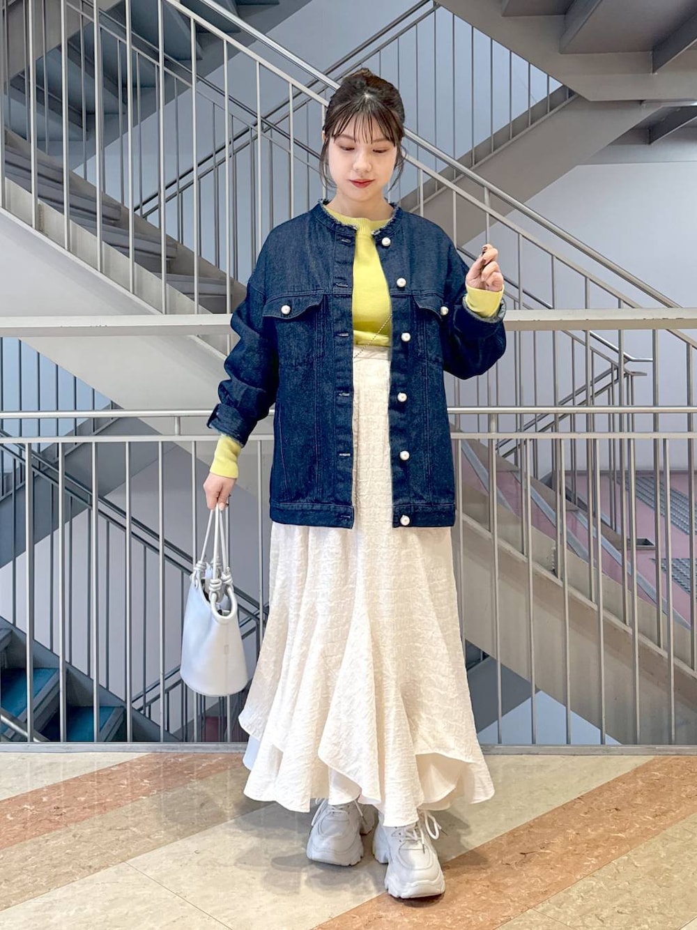 『春カラーコーデ』 ※2枚目の着用動画は明るさの加工なしです! 春のカラーコーデ🎶 デニムジャケットでカジュアルに、 スカートで女性らしさを取り入れつつ合わせてみました♡ アイテムの詳細は下記をご覧下さい! Instagramでは日常も♪ ▷▶▷ コーディネートのご相談なども、 インスタDMにてお返事させて頂いてます♡ 是非お気軽にご連絡ください📮♡ ----------------------------- 【ジャケット】(フリーサイズ) ・パールボタンがポイントのデニムジャケット♡ ・オーバーサイズでボリューム袖のトップスの上からでも羽織りやすいです! ・今の時期はアウター代わりとして、春本番はトップスとしても長く着回しして頂けます^_^ 【トップス】(フリーサイズ) ・程よい厚みのニットなので、春本番まで長く着て頂けます♡ ・首元のスッキリしたデザインが着痩せ効果◎ ・シンプルなデザインなので着回しも抜群です! 【スカート】(フリーサイズ) ・大人気のエスカルゴシリーズ🎶 ・凹凸感のある素材で1枚でもポイントになる素材です♡ ・後ろがゴムなので動きやすくとても楽です! ・着丈は154cmでヒールなしで大丈夫な長さでした♪ ・裾がティアードになっていて、動くと揺れる感じがとっても綺麗です^ ^
