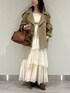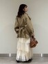 8ヶ月妊婦の春に着たいコーデ🤰🏻🌸 スカートはお腹の上で履いています!✨ ※2枚目〜画像の明るさ加工なしです 👕おすすめポイント  ̄ ̄ ̄ ̄ ̄ ̄ ̄ ̄ ̄ ̄ ̄ ̄ ̄ ̄ ̄ ̄ ̄ 【アウター】(フリーサイズ) ・長すぎず短すぎずな絶妙な着丈で、低身長でもバランス良く着やすいです! ・首元はスタンドネックにもなる2way仕様✨ ・付属のベルトは前で結んでも可愛く着れました♡ ・肩や袖周りはゆったりなので、厚みやデザインがあるトップスの上からでも羽織やすいです^^ 【ニット】(フリーサイズ) ・首元の開き方がちょうどよく、インナーとしても1枚のトップスとしても着やすいニット🤍 ・袖ボタンが可愛いので、上着を重ねた時にチラ見えしてもコーデのポイントになります! ・さらっとした肌触りのニットなので春まで長く着回せそうです!✨ 【スカート】(フリーサイズ) ・ふんわり感が可愛いチュールスカート🤍 ・表面は薄手のチュール素材ですが、内側に裏地があるので透けにくいです◎ ・オールシーズン着やすいお素材で、スウェットやTシャツ合わせでカジュアルダウンしても着やすくなります♡ ・後ろがゴムなので、楽に着やすかったです✨