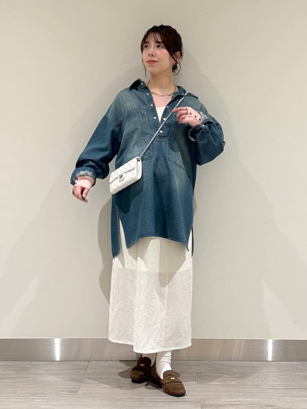 8ヶ月妊婦です🤰🏻 春に着たいデニムコーデ! キャミワンピースをスカート風に着てみました♡ ※2枚目〜画像の明るさ加工なしです 👕おすすめポイント  ̄ ̄ ̄ ̄ ̄ ̄ ̄ ̄ ̄ ̄ ̄ ̄ ̄ ̄ ̄ ̄ ̄ 【シャツ】(フリーサイズ) ・デニムシャツはオーバーサイズなので、お腹やお尻周りもすっぽり隠れる長さです♡ ・柔らかさもある素材で着心地も◎ ・ボトムスを選ばず着やすいデザインで着回しもしやすいです! 【キャミワンピース】(フリーサイズ) ・アジャスター付きで長さ調整も簡単にして着て頂けます♡ ・サイドにファスナーがあり着脱もしやすいデザイン✨ ・タイトめなシルエットですが、後ろがゴムなので少しゆったり着ることができました! ・ペチコート付きで白でも透けにくく安心です◎