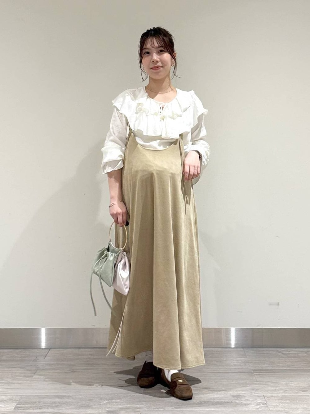 9ヶ月妊婦の春コーデ🤰🏻🌸 ジャンスカはかなりゆったりした着心地です◎ 👕おすすめポイント  ̄ ̄ ̄ ̄ ̄ ̄ ̄ ̄ ̄ ̄ ̄ ̄ ̄ ̄ ̄ ̄ ̄ 【ワンピース】(フリーサイズ) ・着丈の長さ調整が可能です!デニムなどレイヤードコーデにもおすすめ◎ ・表面はスエード素材なので、春・秋と長く着て頂けます♡ ・裏地がないので暖かくなっても着やすく、生地がしっかりしているので透け感も気にならないです✨ 【ブラウス】(フリーサイズ) ・大きなフリルの襟が可愛いブラウス♡ ・リボンを結ぶとキュートな印象に!解くとVネックのデザインでカジュアルな印象にも変わります✨ ・ニットやカーディガンに重ねて、襟を出す着方もかわいいです!🤍