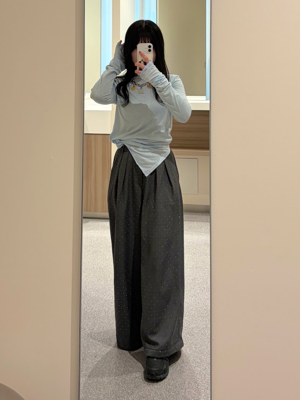 春っぽカラーがカワイイGIUNONのロングシアートップス♩ 淡いブルーの色味はもちろん、裾を結んでレイヤードっぽスタイルにするのも可愛いので色々なスタイリングを楽しめます🫧 パンツはSNSでバズっていたChicoのキラキラスラックスを...♡
