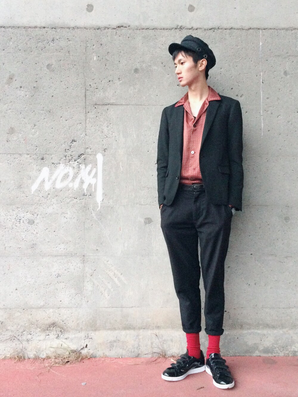 古着で昔っぽさであったり 黒と赤の統一で男くささを 出したつもりです⚫️🔴 スニーカーで少しはずしたり UNIQLOの赤ソックスで 遊んだり統一した割に自由です。 ソックスはリブの強さやプライス的に UNIQLOが好きです。 この時期になるとワンポイントに ソックス使えていいですよね〜 インパクトあるソックス買おうかな💭