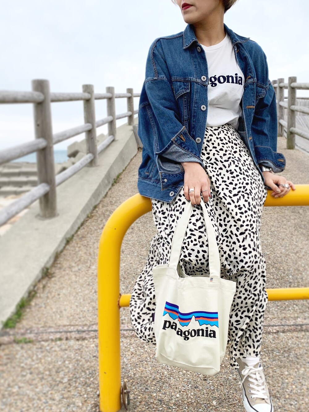 ri7718____bのトートバッグ「Patagonia(パタゴニア) ミニ・トート #59275 カラー P-6 Logo: Bleached Stone (PLBS)」を使ったコーディネート