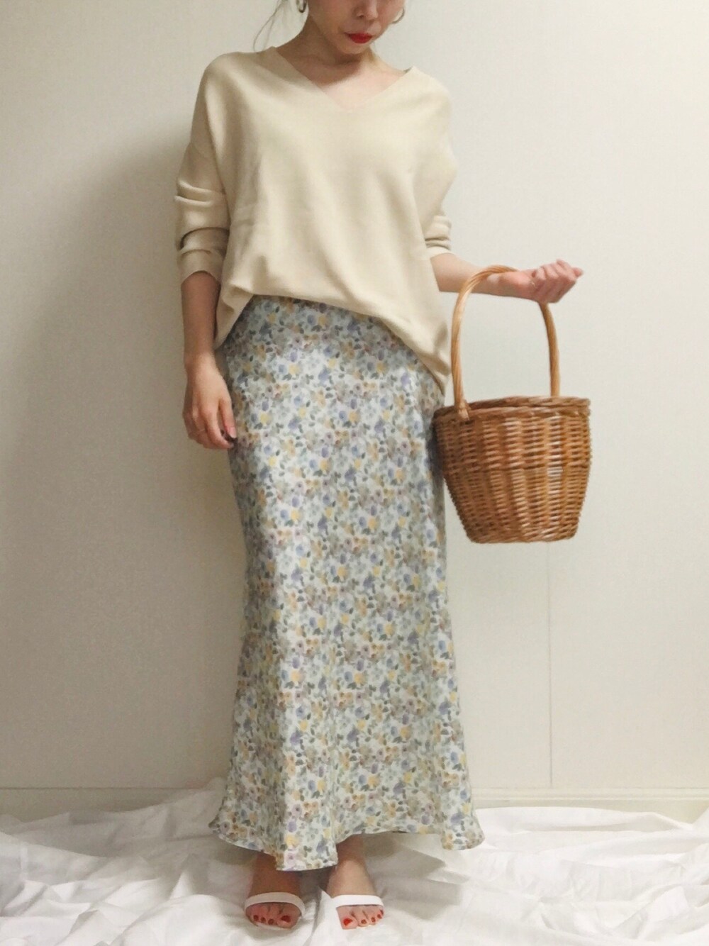 横に広がらず縦ライン作れるサテンスカートはおチビに👍 ギリギリ下にはついてません🥴 (147cm XSサイズはいてます) ニットは2年前位に買ってまだ着てます! いやいやまだまだ着ます! 高かったけど肩の落ち感&首のひらきがやっぱりキレイ🤑✨ 〜サテン&花柄って最強説〜