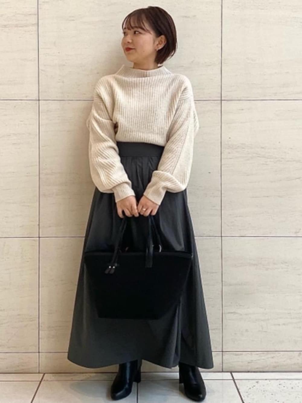 身長150cm 着用サイズ:ニット・スカート (FREE) シューズ(M) ボリューム感たっぷりのスカートを主役に! スカートはしっかり丈があった方が今年っぽく、カジュアルなニット合わせでもエレガントな印象に◎スッキリするので低身長さんにはブーツ合わせでおすすめしたいです♪