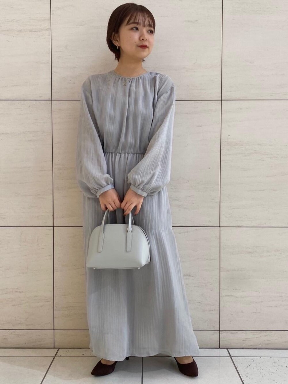 身長150cm 着用サイズ:ワンピース(FREE) シューズ(22.5cm ヒール7cm) きれい見えするワンピースですが、ウエストがゴムでゆったりと着られます!オケージョン用でも、スニーカーを合わせたり、上からニットを合わせればカジュアルにもお使いいただけます♪ パンプスは黒よりも柔らかい印象になる、ダークブラウンを合わせました!