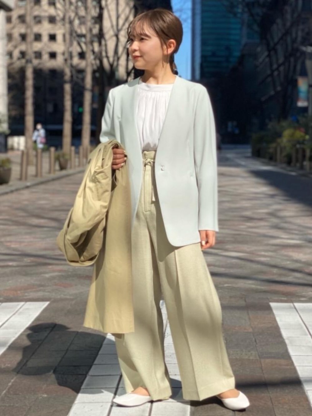 身長150cm 着用サイズ:ジャケット・パンツ ( 36 ) ブラウス ( FREE ) シューズ ( 22.5cm ) 今年のキーカラー “ライム” のジャケットを主役に、ワントーンでまとめました♪ ジャケットでフォーマルな印象になるので、パンツはストレートワイドを選び少し抜け感をプラス◎