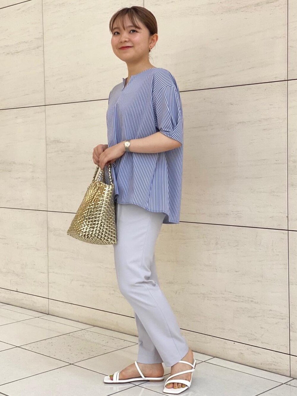 【身長 150cm】 爽やかなブルーのワントーンコーデです。サンダルとバックで夏らしさをプラス◎小物やシューズを変えれば、オフィススタイルでもおすすめのスタイリングです♪
