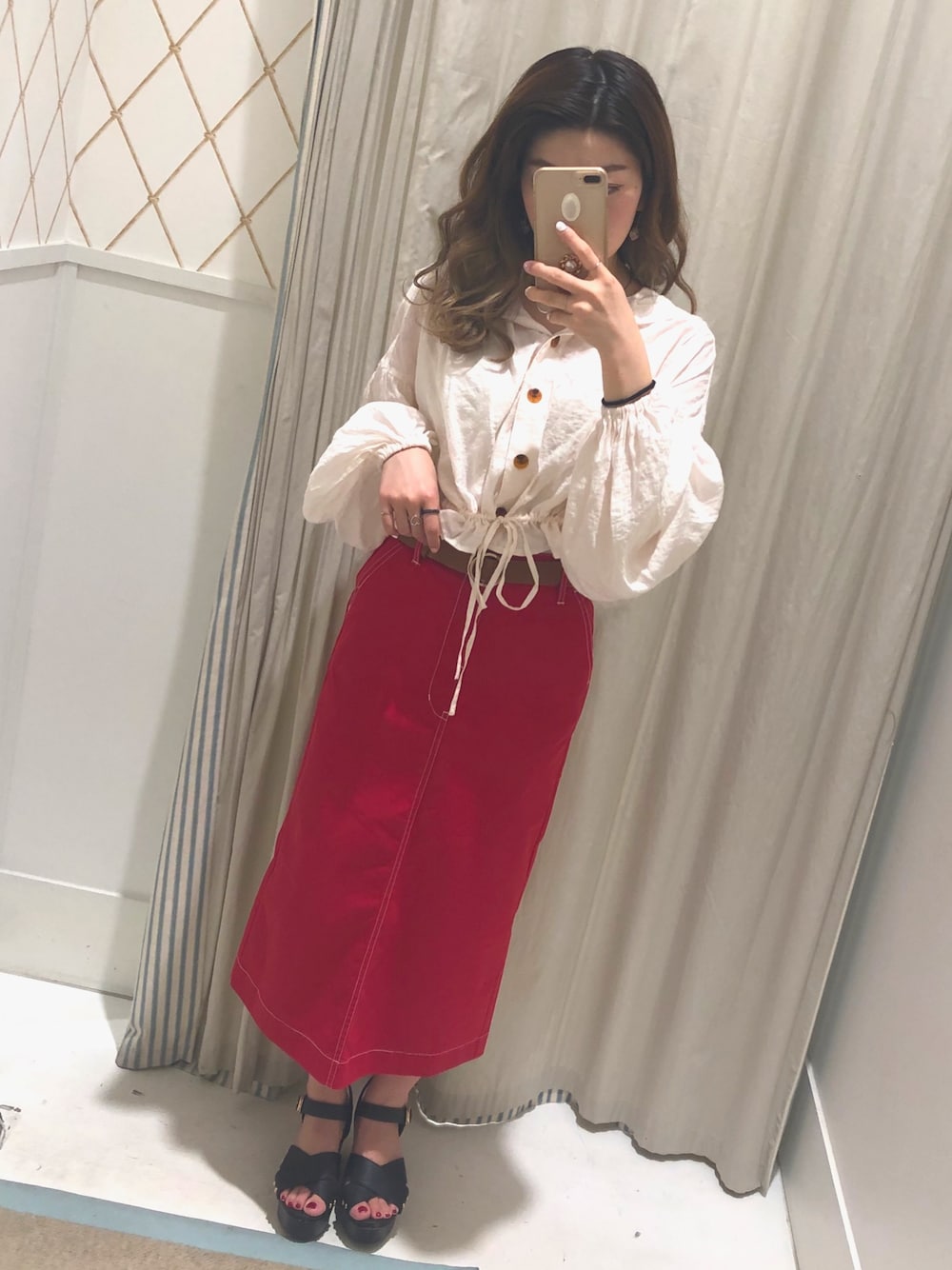 出勤コーデ︎︎︎︎☺︎ 最近GETした赤いスカートが履きたくて履きたくて😚💕 上はHeatherの透け感のあるトップスで夏っぽさも◎ サンダルもクッション性抜群で全然疲れない優れもの🙆🏻♀️