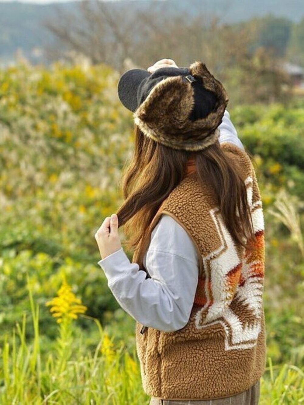 すすきや黄色い花が咲く秋の草と共に自然を楽しむ〜💗 #キャンプコーデ . . #フェイクファー耳付きキャップ #icap0250 #イチヨンプラス