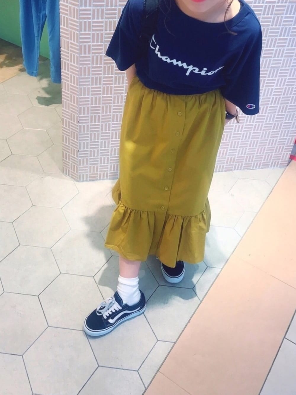 . . . earth×championのコラボTシャツ👕 カジュアルだからボトムスは フリルが可愛いスカートをチョイス☝🏻✨
