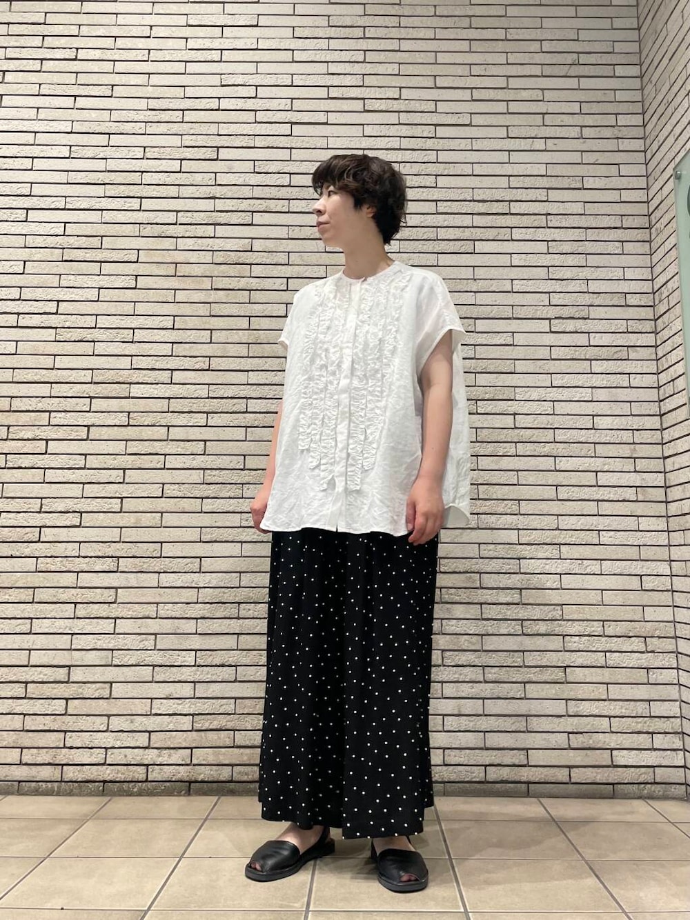 こんばんは。いわぶです。 涼しいリネンのブラウスに、ドット柄のパンツを合わせたクラシックスタイルです。 トップスは、フリルがアクセントになり素材感と相まって大人かわいい1着です。身幅がゆったり涼しく着用いただけます。 ボトムはスカート見えするギャザーパンツです。とろみのある落ち感で、カジュアルなトップスもラフに見えずシックな雰囲気に◎ ぜひお試しくださいませ💐