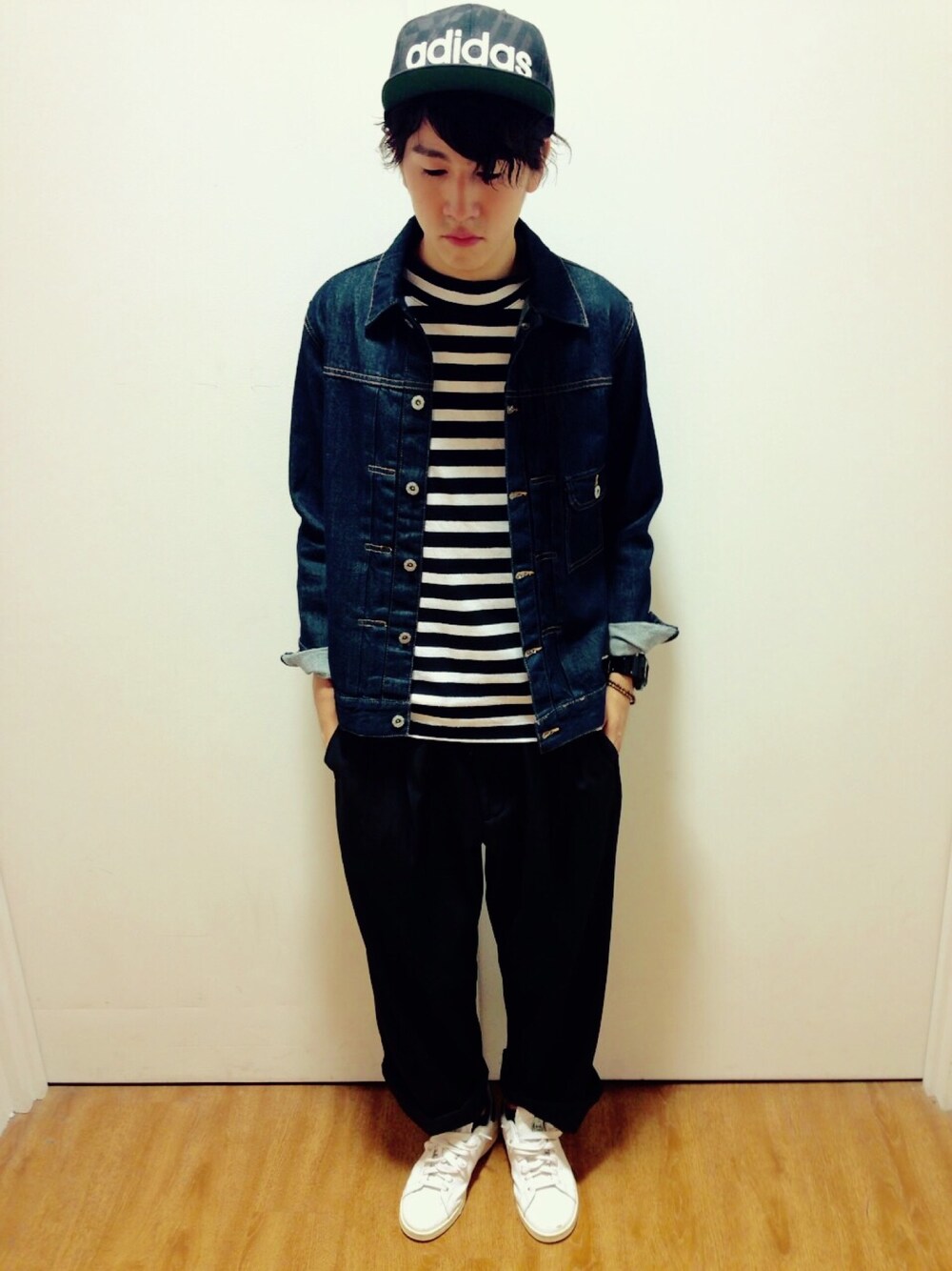 ボーダーとデニムジャケットの相性は◎ ネックがモックタイプなのが今年風! 更にトレンド感満載のワイドパンツで、 一気にオシャレに!