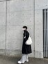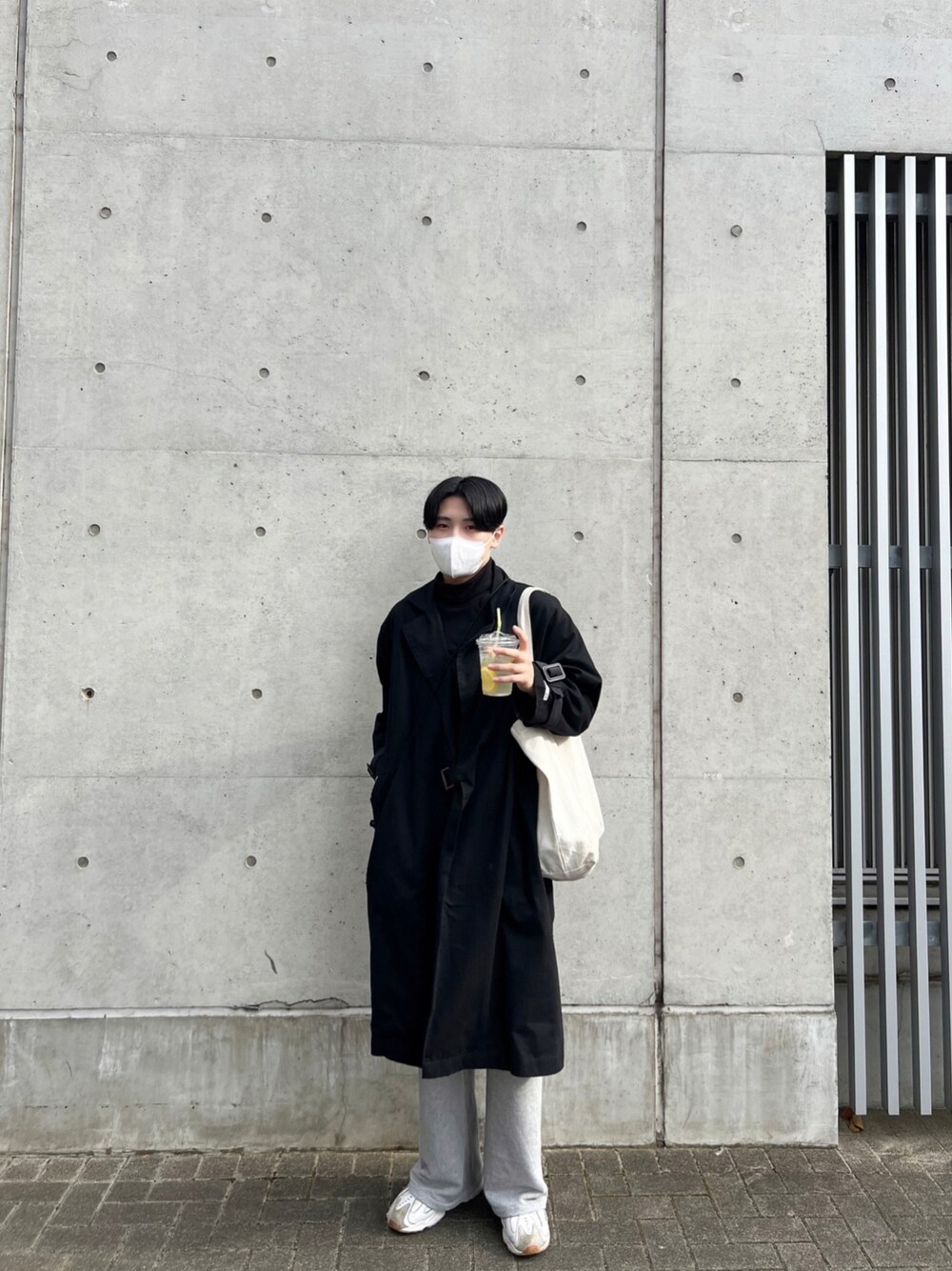 コート×スウェット 上を黒でまとめて下はゆるっとスウェットを合わせることでラフすぎない雰囲気を意識しました。