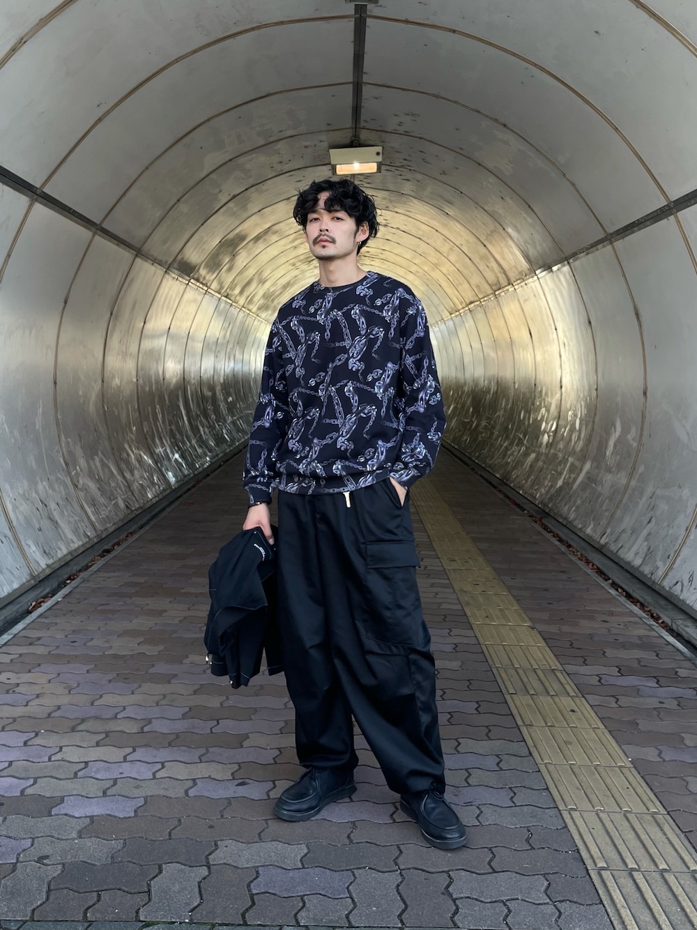 ブラック系のカーゴパンツを着用したメンズの秋コーディネートの1枚目の写真