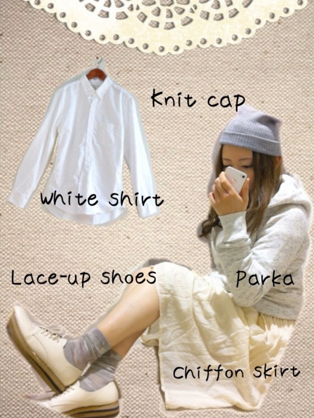 Cap : FOREVER21 Parka : UNIQLO Skirt : studio CLIP 春はスカート****