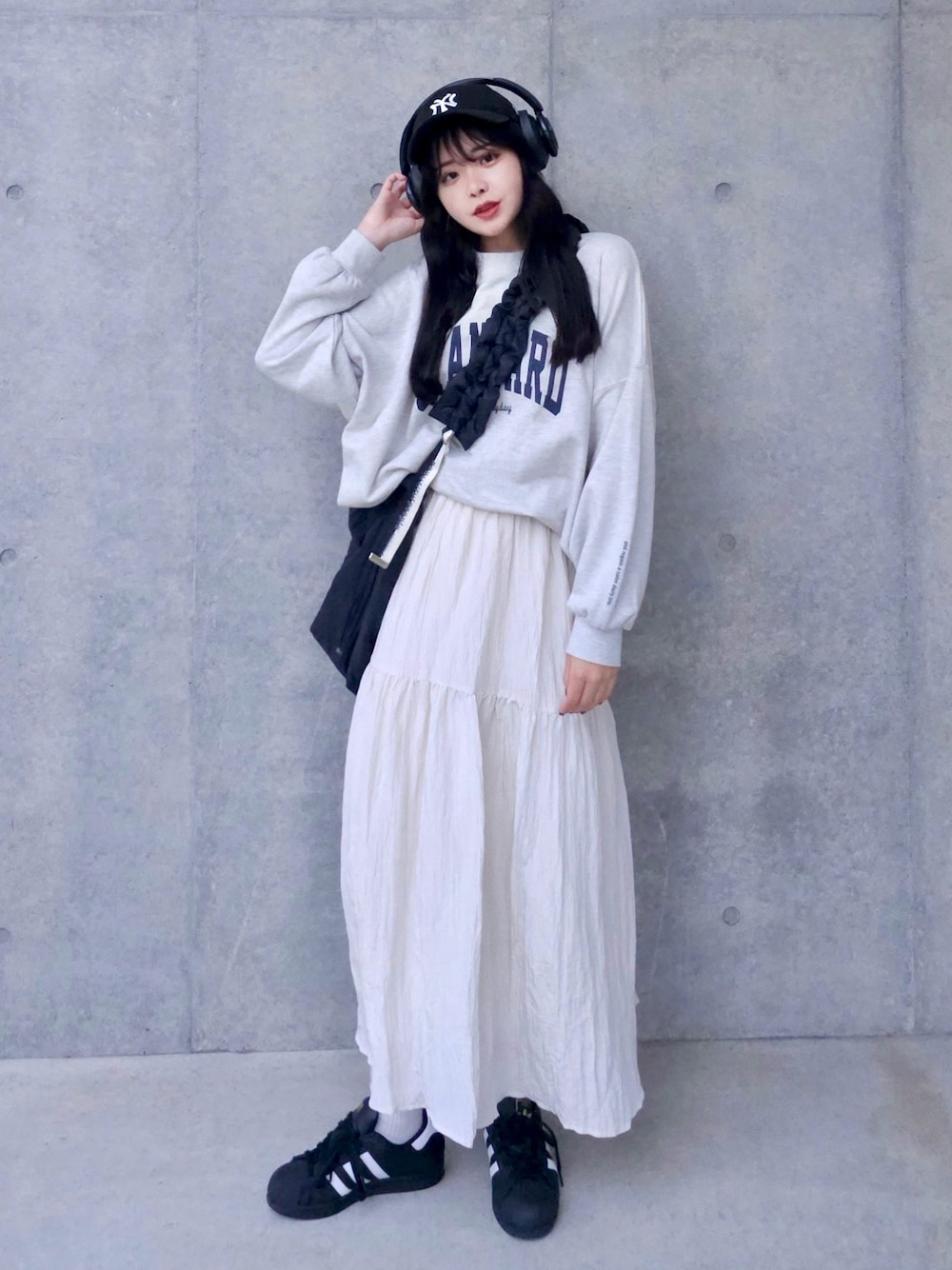 ストリートな組み合わせにアイボリーのティアードスカートで レディース要素も入れたカジュアルコーデ🧸💭 ヘッドフォンコーデ好評だったので今回も....🫣♡ 愛用しているのはAnker Soundcore Space Q45です🎧