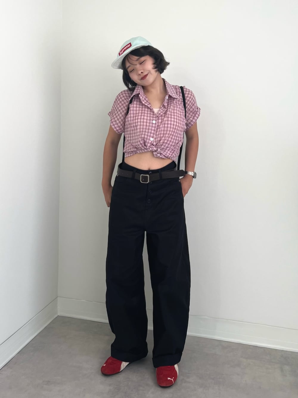 ピンクのシアーチェックシャツを使ったストリートコーデ🍒