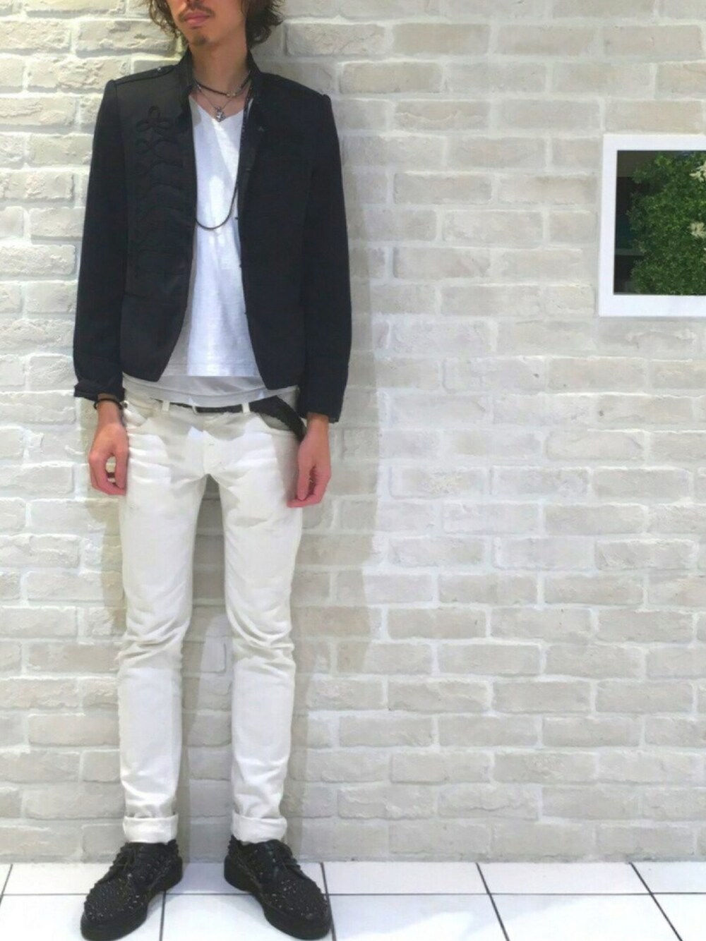 今回はナポレオンジャケットのショートで! インナーをジャケットよりもちょいと長めを チョイス‼︎ ショートのトップスを着る時、インナーの長さに ちょいとこだわりが‼︎ パンツをブラックにすると学ランを着て 見えるのでパンツは白で笑 本日の営業スタイルです( ´ ▽ ` )ノ