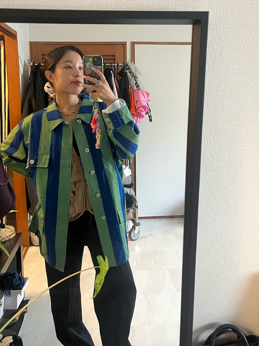 大人っぽくなりすぎないように中にフィッシングベストを。♡ かなり前に流行ったフィッシングベスト、いつか着るだろう〜と手放さなくてよかった〜 シャツはHで購入したvintageのもの💚💙 ネックレスは私のブランドです〜チェックしてね! IG:@polso99japan 足元はマルジェラの足袋できまりー!