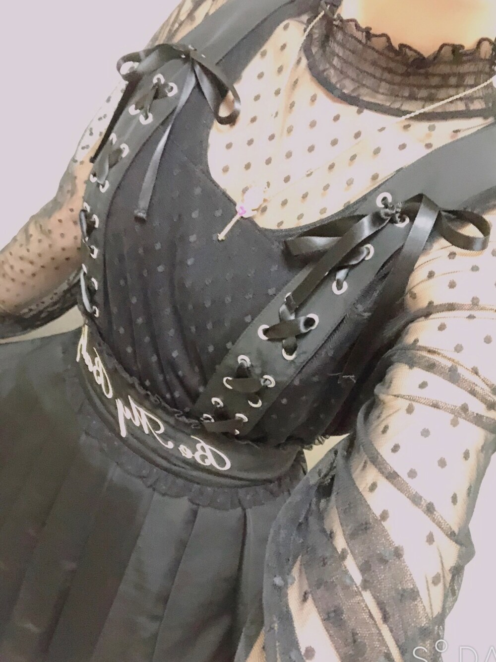 全身黒コーデ🖤🎮💀 AnkRougeのプリーツスカートはサスペンダーがついててめっちゃ可愛い( ⸝⸝⸝ᵒ̴̶̷ωᵒ̴̶̷⸝⸝⸝) ゴールドのロゴ刺繍もお気に入り! 黒いブラウス持ってなかったからWEGOの透けてるトップスで代用した〜笑