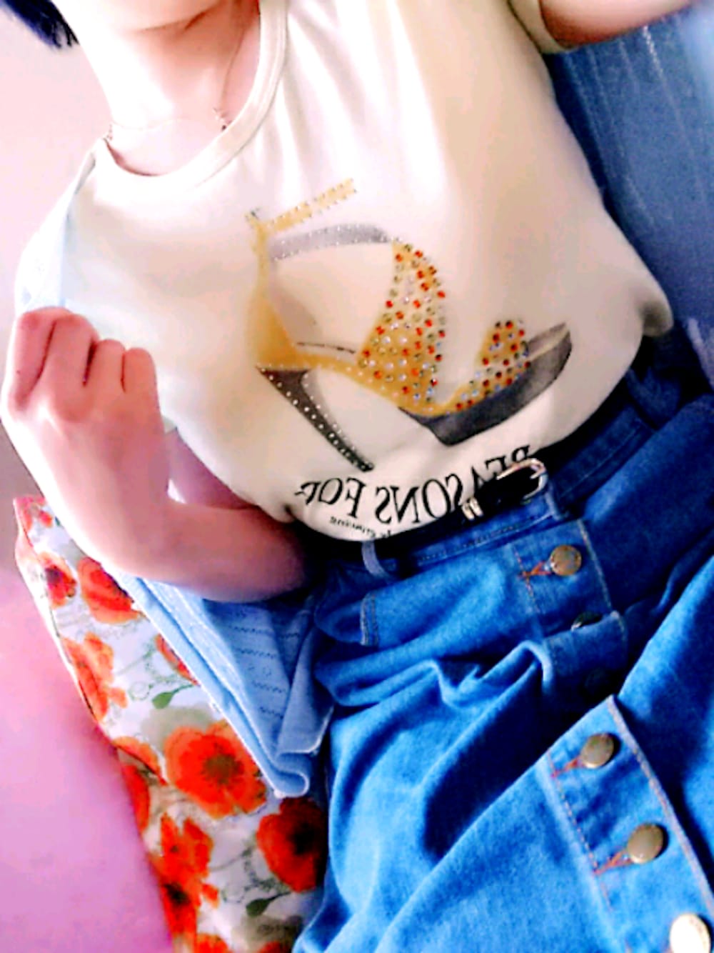 たまには洋服も…♪ Tシャツ+デニムスカートという、ありきたりコーデ(*´ω`;) 見えずらいですが、レースカーディガンで夏感増量中!笑