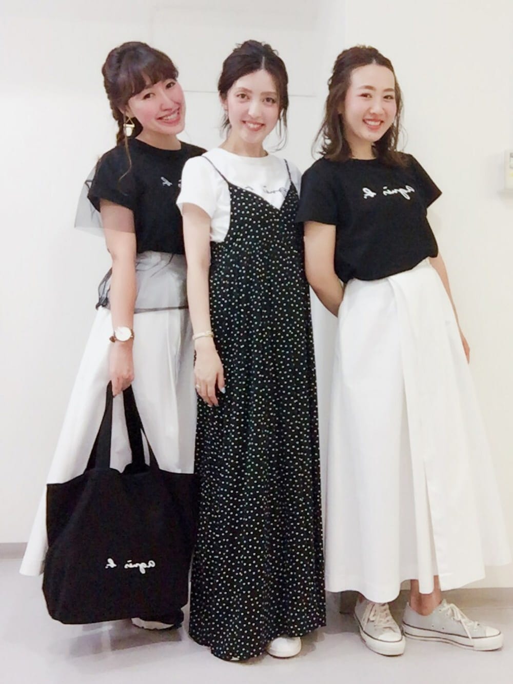 みぽちあゆー3人で、べーT着用してパーティへ 🍴🍸 🙆🙋💁 モノトーンで、まとめました♡ それぞれの個性で、チュールを合わせたり😚色々な着こなしが出来るべーT♡ 近々またおそろいで着る予定🙋 ワクワク😚