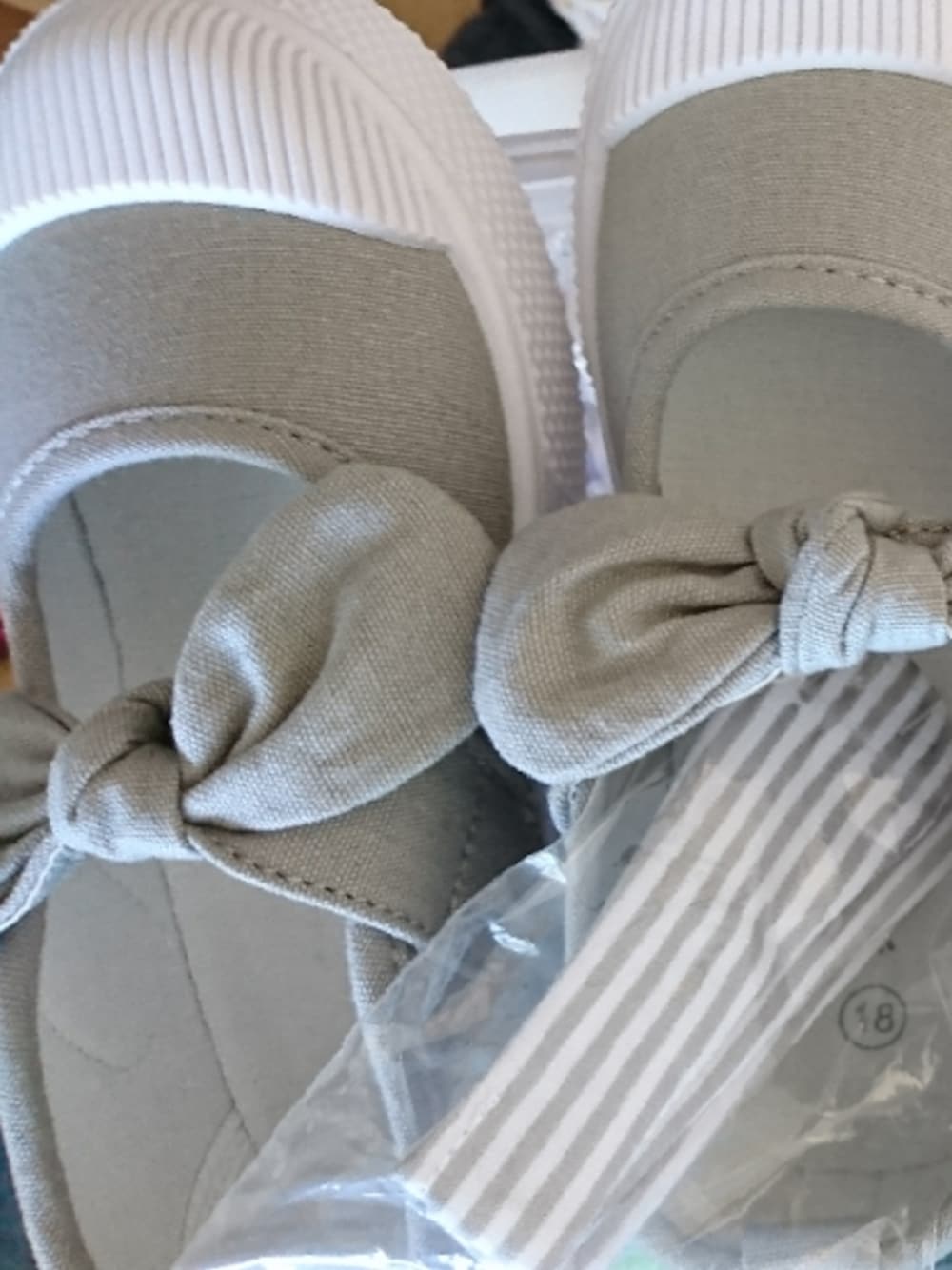娘の子供用パンプス??長女のグレー届いた!スリッポンてきなやつ❤️リボンがめっちゃ可愛い。履きやすいみたい!買って良かった。リボンは付属のしましまと交換できる❗可愛い💜💛ロコンドで購入
