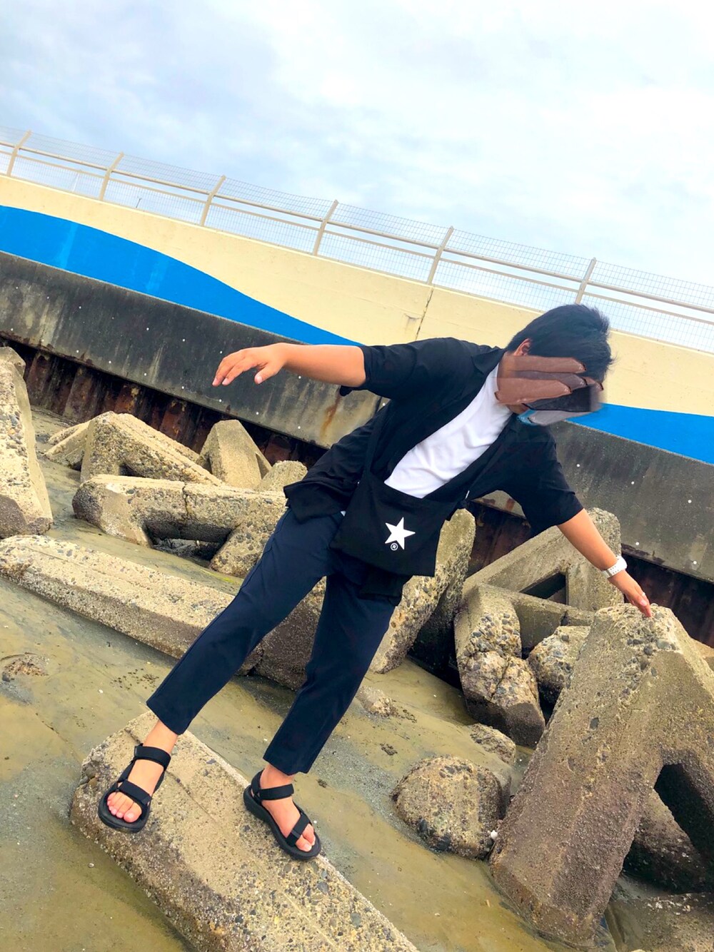 海でふざけて撮りました🥺 足元を涼しげに決めて暗くなりがちなので白Tでアクセントを入れました😄