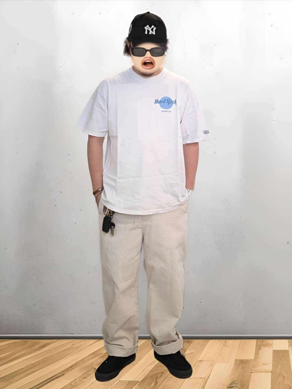 キャップ:NEWERA Cooperstown Collection Tシャツ:古着 Hard Rock Cafe パンツ:ユニクロ スニーカー:VANS HalfCab