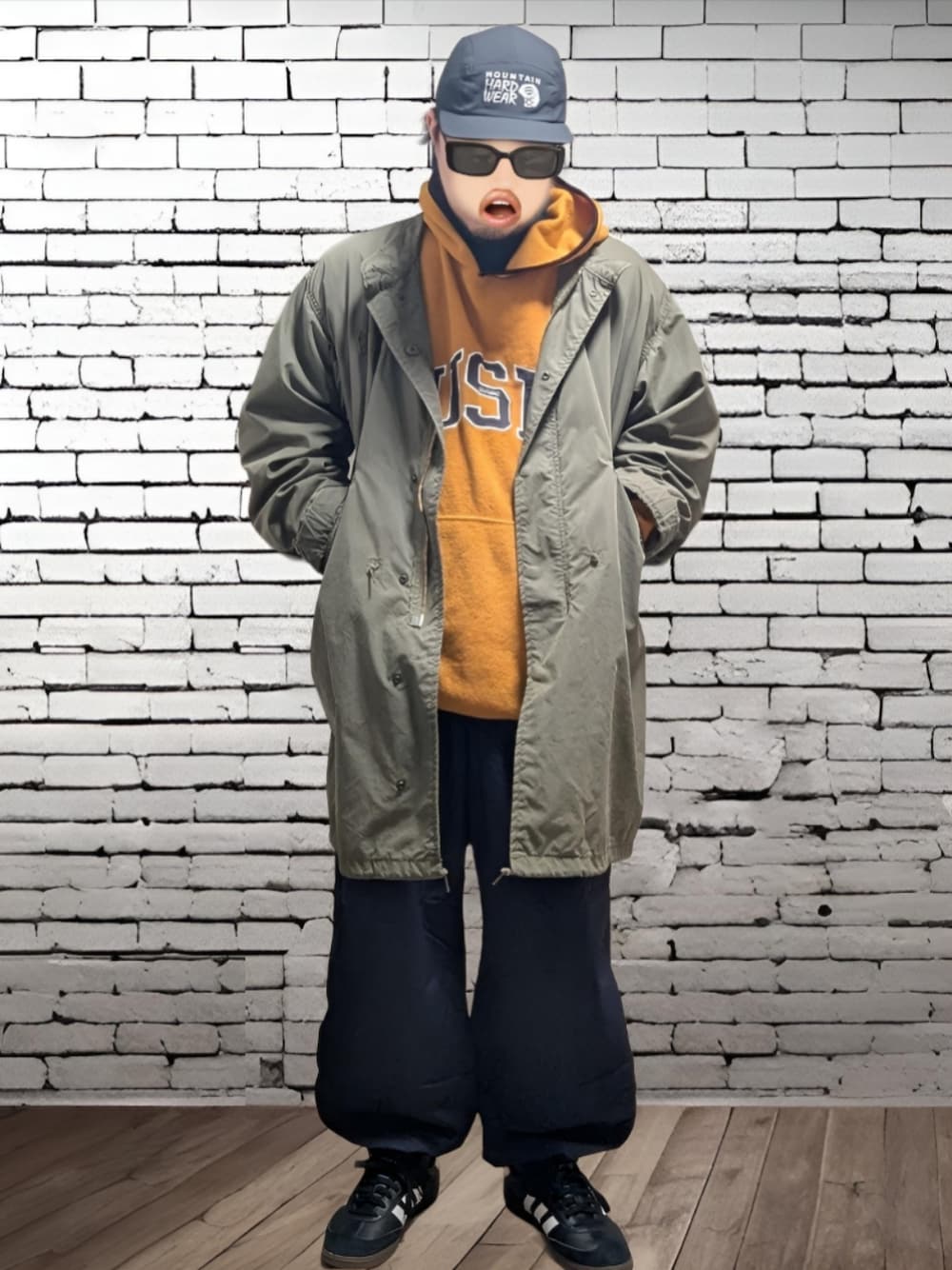 キャップ:MOUNTAIN HARD WEAR M65:古着ALPHA フリース:古着 パンツ:WORKMAN スニーカー:adidas SAMBA