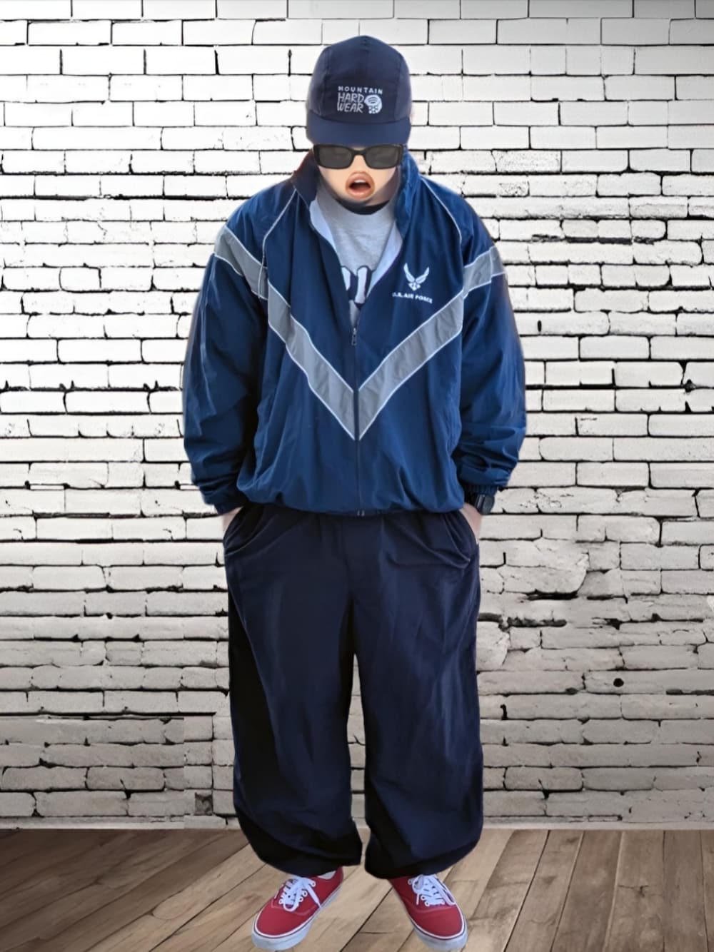 キャップ:MOUNTAIN HARDWEAR アウター:古着US NAVY トレーニングジャケット スウェット:GAP ナイロンパンツ:WORKMAN スニーカー:VANSオーセンティック
