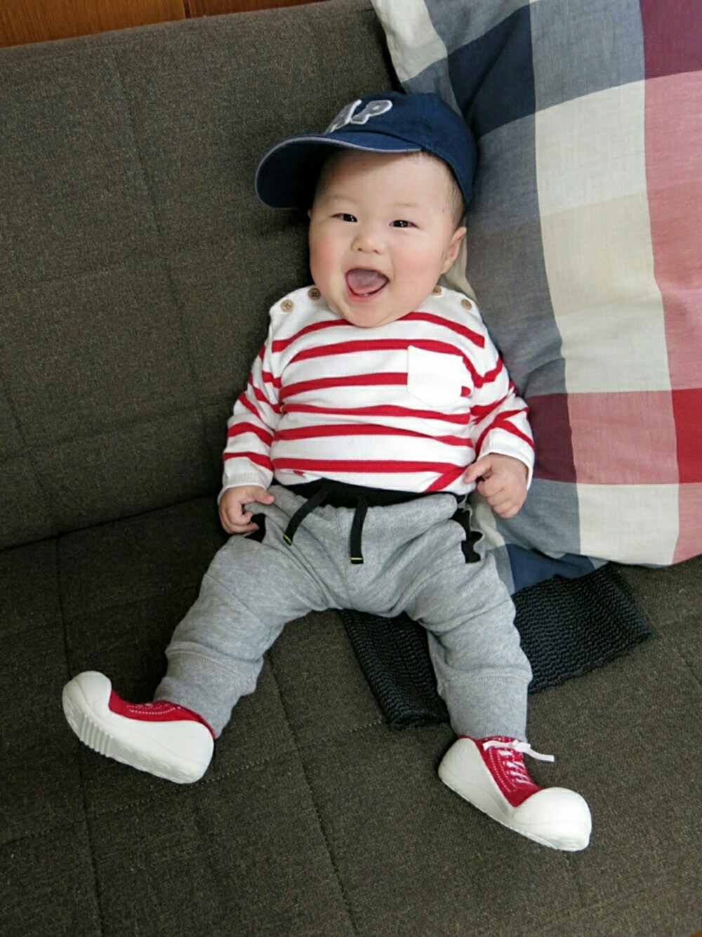 赤白ボーダートップスと グレースエットパンツのコーデ★ 肩のとこのボタン 着替えさせるときちょと面倒やけど かわいくて、すき(*´◇`*) ちょっとWEARお休みしてた間に 寝返りが上手になって ずりずりと移動するようにもなりました♡ 今からみんなのコーデ見て楽しませてもらうね!!
