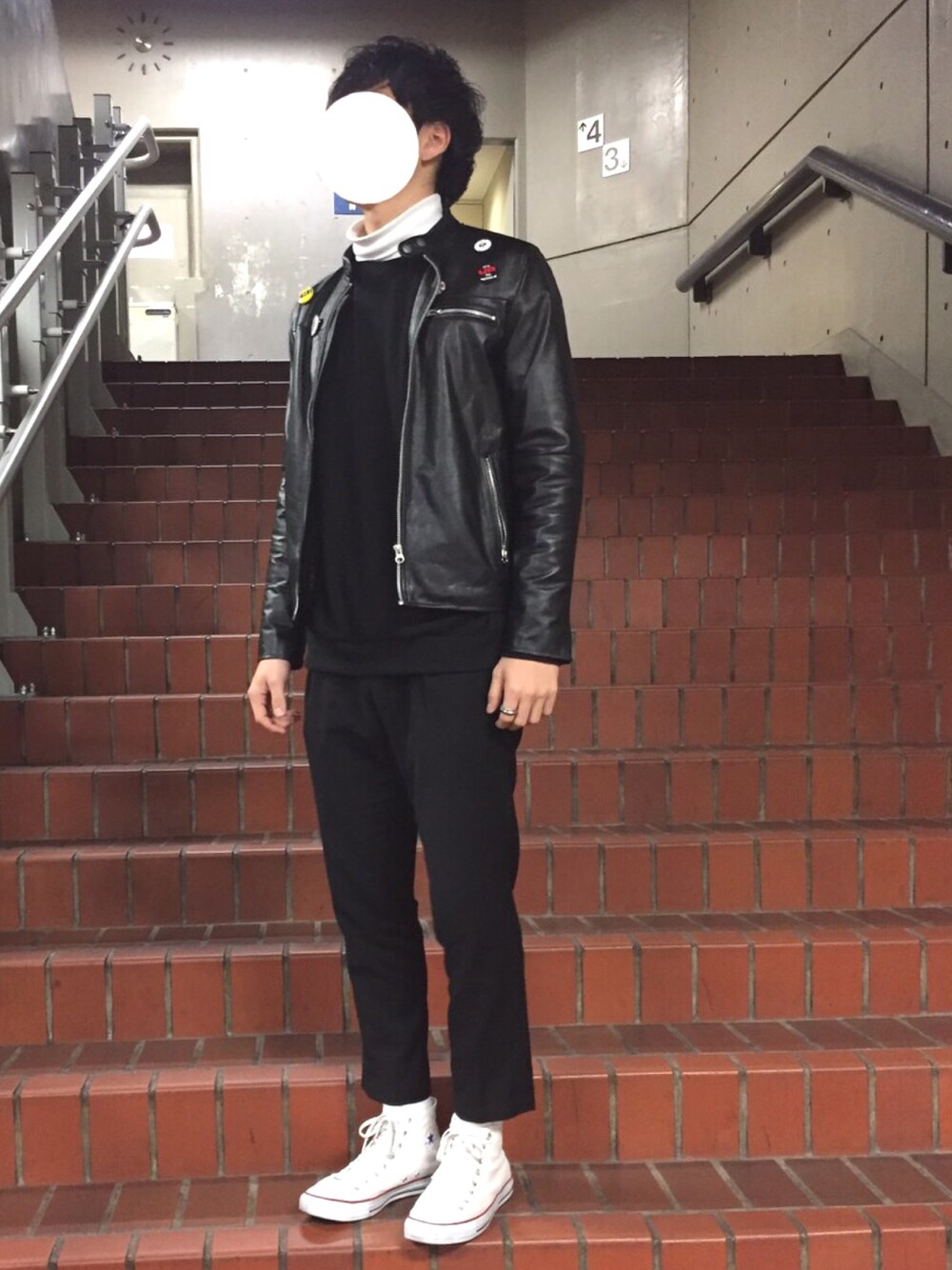 お久しぶりです。あけましておめでとうございます。🙋🏻♂️ 本日のコーデは黒と白のツートーンでまとめました。革ジャンにバッジを付けてるのがポイントです🙋🏻♂️ HAREのスラックスとても使いやすい有能👏🏼 ウールなので夏以外は使えるかなって感じです☺