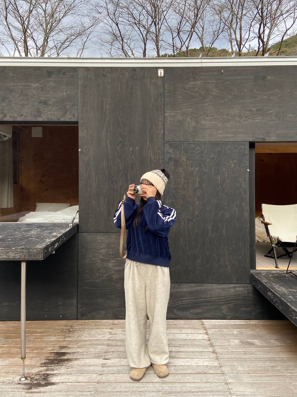 Instagram:🐕🦺 グランピングコーデの中!! トレンド感あるネイビー×グレーのコーデにしました✨