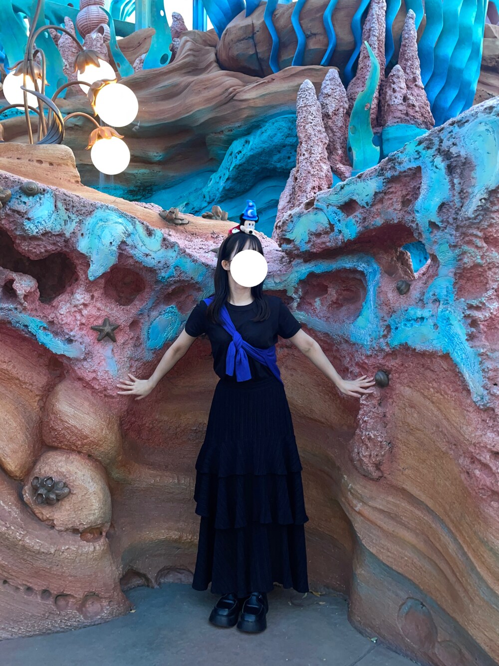 お友達とディズニー行ってきました ブラックコーデにブルー差し色指定で、シンプルだけど写真映え👏🏻 新エリアには行けずでしたが楽しかった〜