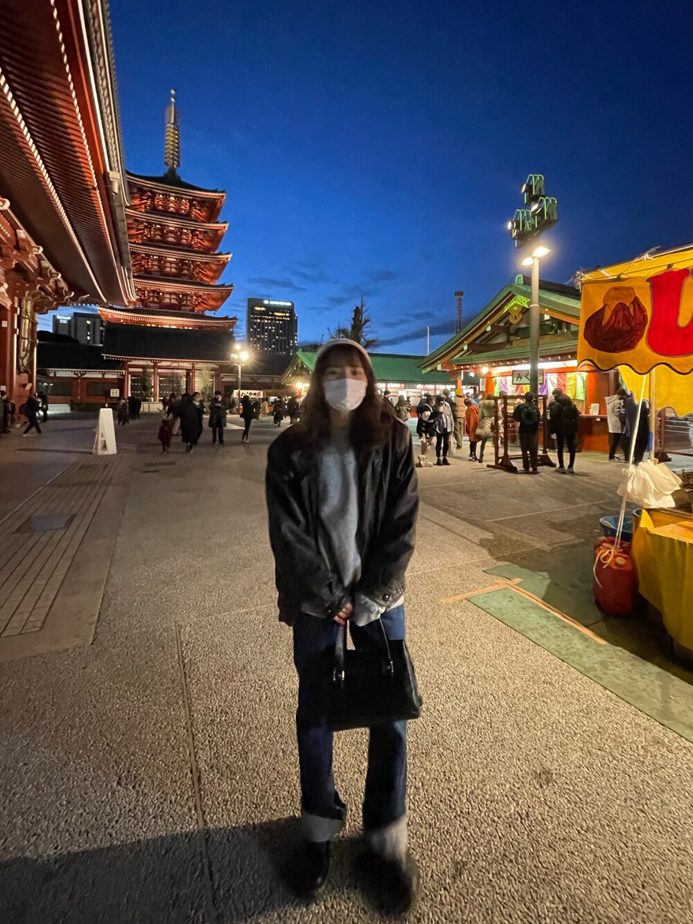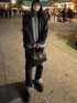 ポンポン帽子と革ジャンと大きめのジーンズから見えるブーツがかわいい