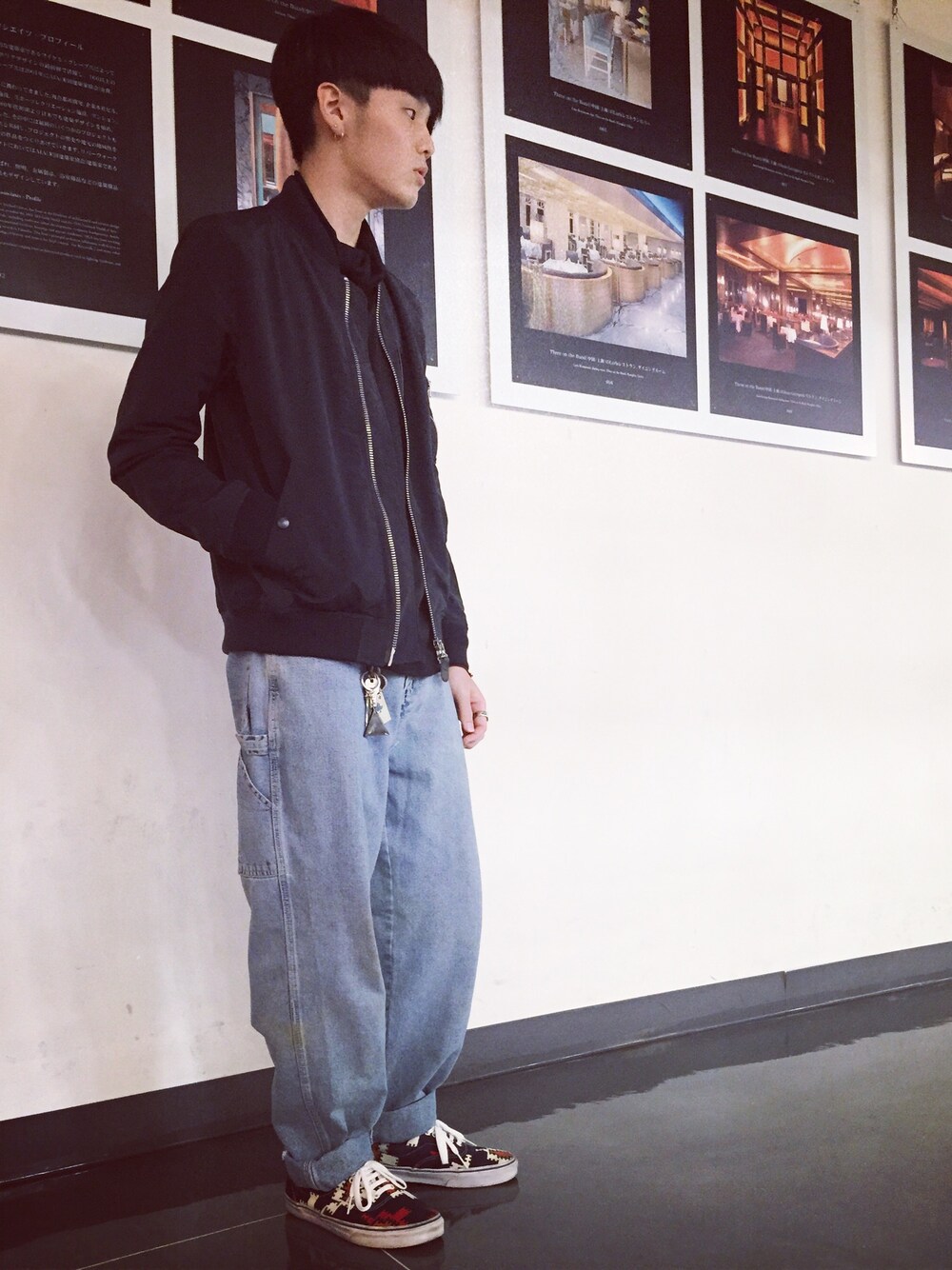 かなり深いネイビーのMA-1を! 中綿が入ってないので暑すぎず、 寒すぎず、抜群にかっこいいです。 インナーにタートルネックという 組み合わせで個性を出してみました。 デニムはブルーでかなりワイドな、 ペインターパンツになってます。 リメイクされてて、股下を切って さらにワイドに若干サルエル感を。
